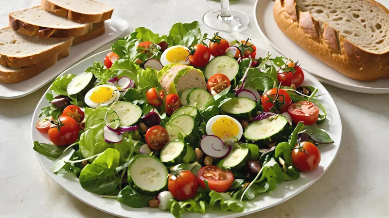 그릭 샐러드는 토마토, 오이, 올리브, 피망, 페타 치즈 등으로 구성된 샐러드로, 지중해식 식단의 대표적인 음식입니다. 토마토에는 강력한 항산화 성분인 리코펜이 풍부해 노화 방지와 심혈관 건강에 도움을 줍니다.