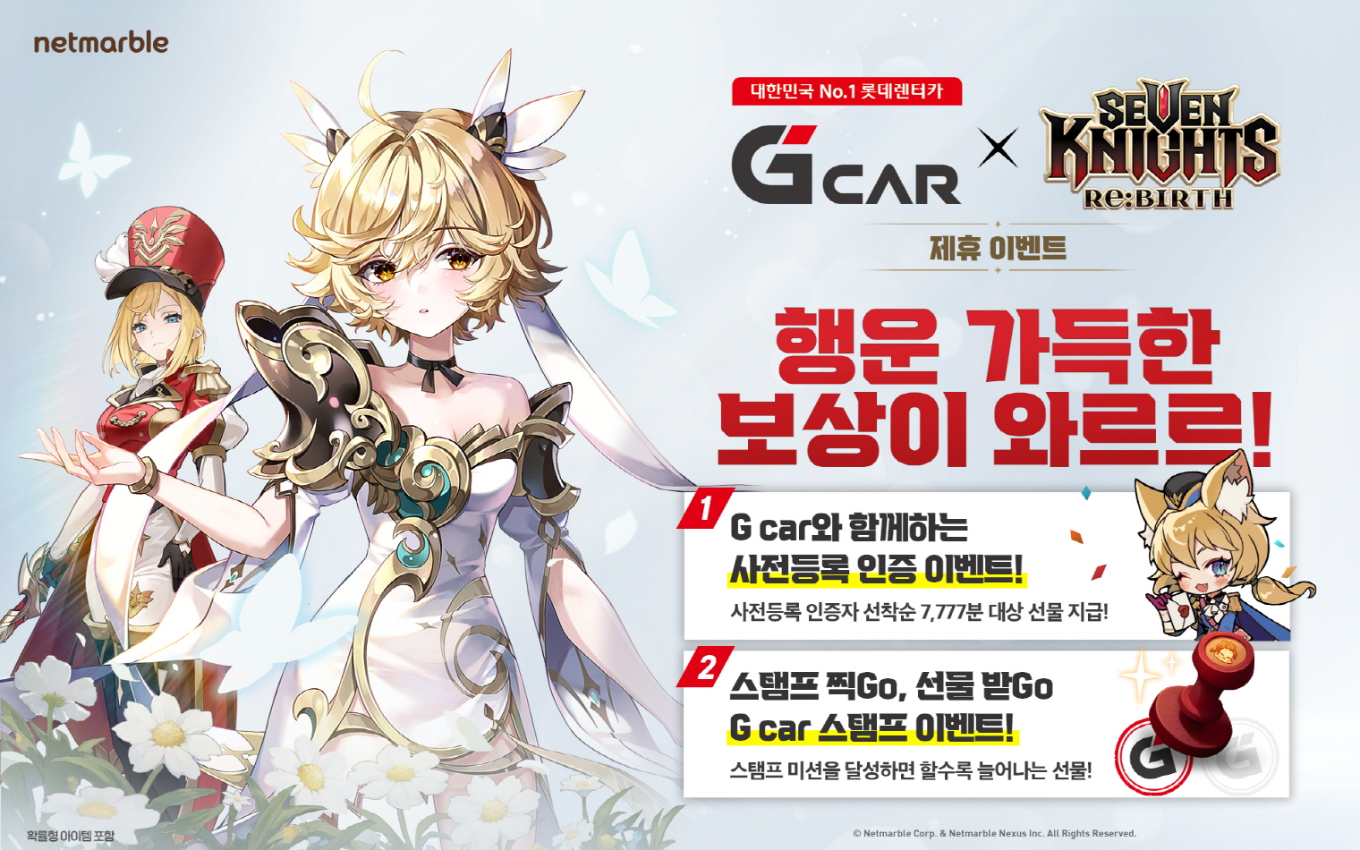 '세븐나이츠 리버스'는 롯데렌터카 G car와 제휴하여 특별 이벤트를 진행하였습니다. 세븐나이츠 리버스를 사전등록을 완료하고 G car 앱 내 이벤트 페이지에 접속하여 인증 댓글과 기대평을 작성하면, 사전등록을 완료한분들 중 선착순 7,777명에게 다양한 쿠폰이 제공되었습니다. 또한, 5월 15일부터 31일까지 스탬프 이벤트를 통해 추가 보상도 받을 수 있습니다.