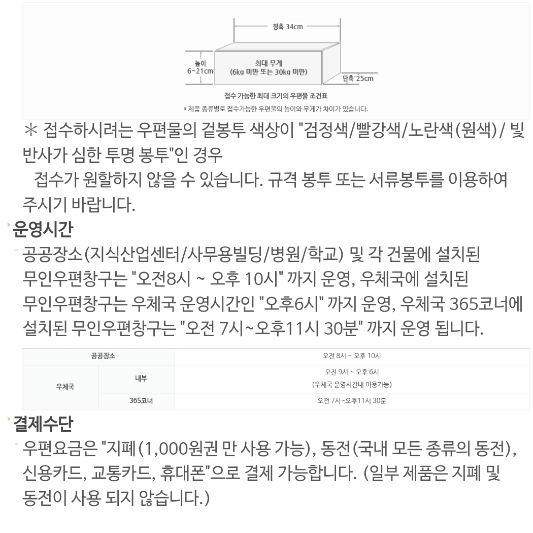 • 옥외에 설치된 무인 우편창구는 연중무휴 08:00~22:00 운영되며, 토요일에도 우체국 택배 접수가 가능합니다.