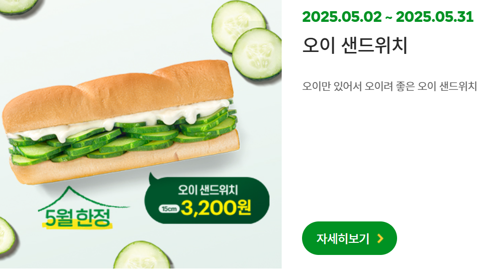 오이를 좋아하는 소비자들 사이에서는 호평을 받고 있으며, 단백한 맛과 식감 중심의 조합으로 새로운 입소문을 만들어가고 있습니다. 서브웨이 5행사 가장 화제가 되는 요소입니다.