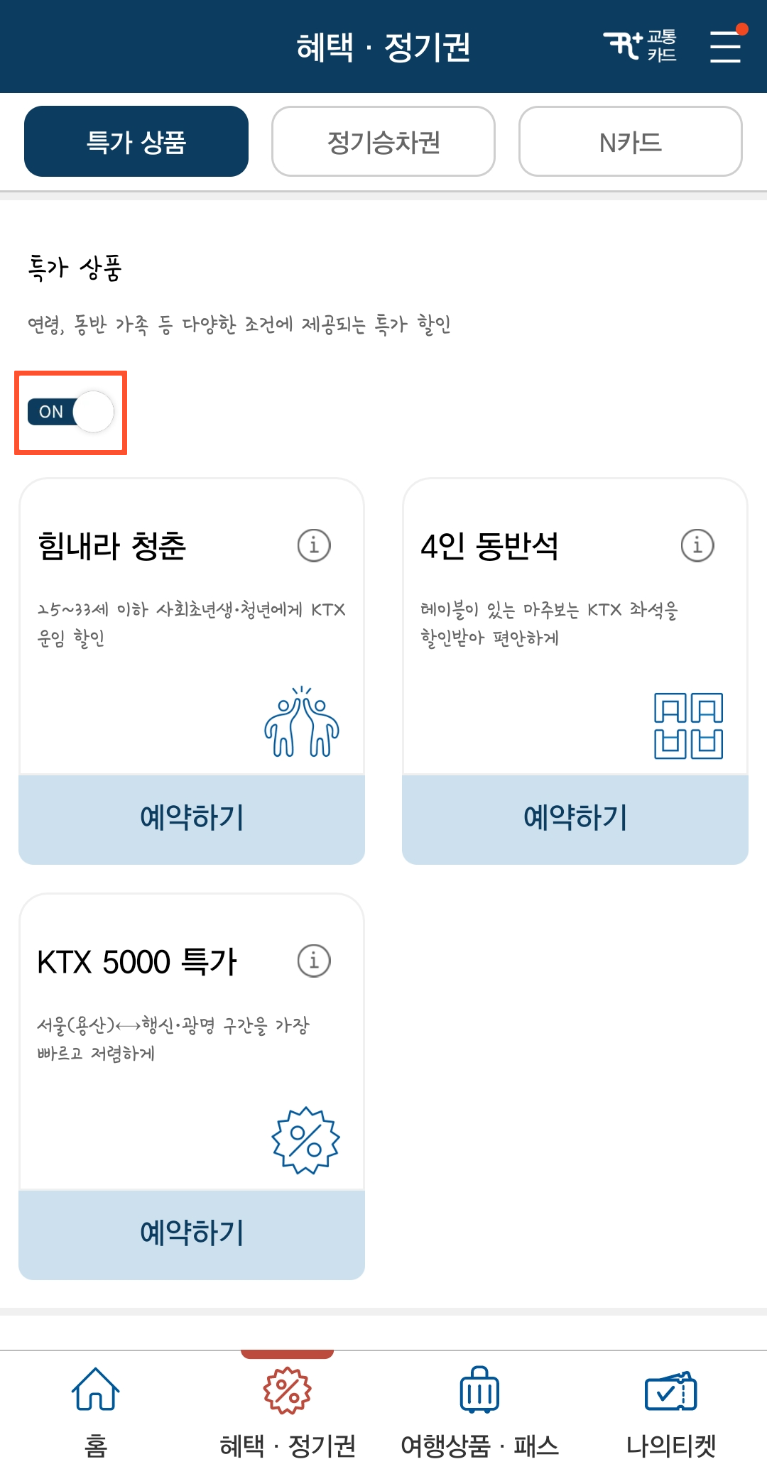 +)특가 상품에 표시된 ON버튼을 클릭하면, 예매자에게 맞는 할인 상품을 바로 확인해 줄 수 있어서 편리합니다.
