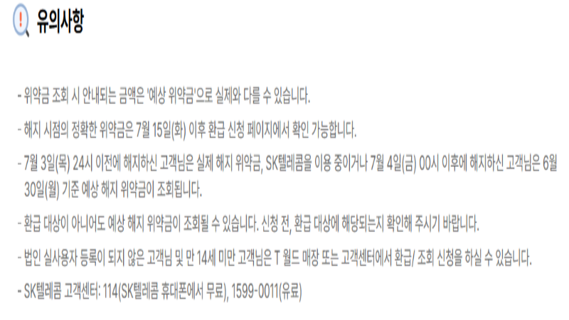 공식 홈페이지에는 계산기 메뉴는 없지만, T월드 로그인 후 ‘해지 예상 위약금’ 메뉴를 선택하면 자동 계산됩니다.